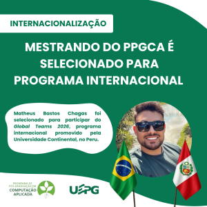 O mestrando Matheus Bastos Chagas, do Programa de Pós-Graduação em Computação Aplicada (PPGCA), foi selecionado para participar do Global Teams 2026, uma iniciativa internacional que reúne estudantes de diferentes países e áreas do conhecimento para o desenvolvimento de soluções inovadoras voltadas a desafios globais.