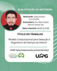 O Programa de Pós-Graduação em Computação Aplicada da Universidade Estadual de Ponta Grossa (UEPG) realiza, nesta segunda-feira (06), às 9h, a qualificação de mestrado do estudante Isaias Jonatan Cruz Castillo.
