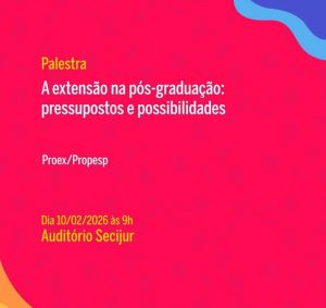 A Universidade realiza, no dia 10 de fevereiro de 2026, às 9h, a palestra “A extensão na pós-graduação: pressupostos e possibilidades”, que acontecerá no Auditório Secijur.