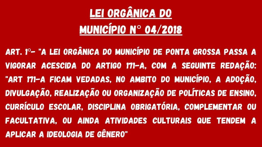 Desde 2015, Ponta Grossa registrou três projetos propostos e 27 menções ao termo “ideologia de gênero” via atas de sessão na Câmara dos Vereadores. O primeiro projeto apresentado em 2018 e arquivado, diz respeito à alteração na Lei Orgânica do município N° 04/2018.
