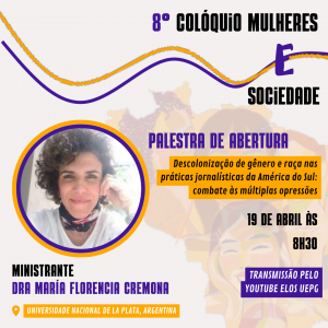 Para a abertura do 8° Colóquio Mulheres e Sociedade, no dia 19 de abril, a pesquisadora Dr. María Florencia Cremona, ministrará a palestra “Descolonização de gênero e raça nas práticas jornalísticas da América do Sul: combate às múltiplas opressões” diretamente de Buenos Aires, na Argentina. O evento terá início a partir das 8h30 através do Youtube do projeto Elos.