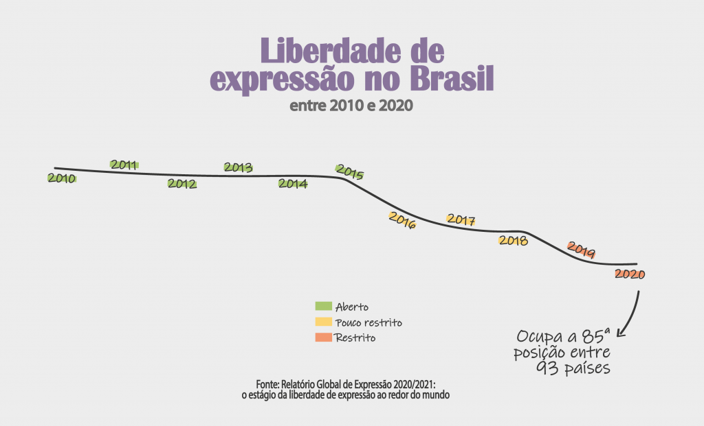 Em 10 anos, o Brasil variou sua postura, aumentando o índice de censura, por exemplo. De 2010 a 2015, era considerado aberto à liberdade de expressão, mudando o cenário entre 2016 e 2018, decaindo para pouco restrito. Desde 2019, é classificado como restrito, como é possível verificar no gráfico abaixo. Em 2020, ocupou um dos últimos lugares na posição global de liberdade de expressão.