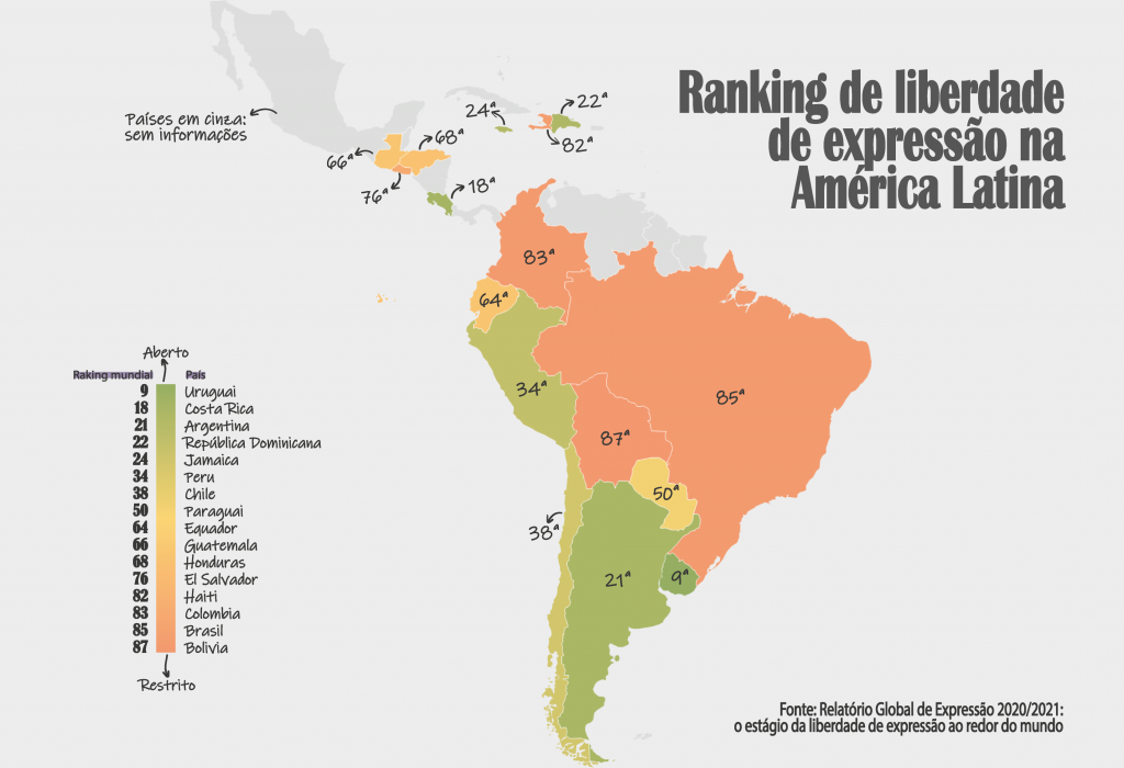 Dentre 20 países que compõem a América Latina, apenas 16 tinham informações disponíveis no Relatório. No infográfico abaixo, há a categoria de expressão e o ranking de cada um dos países, variando entre aberto e restrito. Em 2020, o país mais aberto em relação à liberdade de expressão é o Uruguai, ocupando a 9ª posição. Já o mais restrito é a Bolívia, em 87º lugar do total de 93.