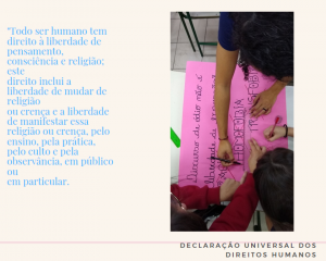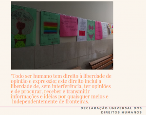 O ensaio traz a representação e o posicionamento dos alunos contra o preconceito e descriminação. Em cartazes, destacam o combate ao racismo e à lgbtfobia.