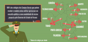 União Paranaense dos Estudantes Secundaristas (UPES) e Sindicato dos Trabalhadores em Educação Pública do Paraná (APP) são contrários a implantação dos Colégios Cívicos-Militares no estado. Na região dos Campos Gerais, o sistema pode ser implementado em 21 colégios de 12 cidades, com pode ser observado no infográfico, que se encaixam nos padrões apresentados pelo governo, uma vez que já foi aprovado em votação o funcionamento do ensino Cívico-Militar. “A militarização das escolas separa a gestão da prática pedagógica, impossibilitando um trabalho amplo que articule questões administrativas, financeiras e pedagógicas”, defende a pesquisadora em Gestão e Política Escolar, Simone de Fátima Flach. Ela explica que o gestor escolar é o profissional responsável pela organização administrativa, financeira e pedagógica da instituição escolar. “Por isso, o gestor precisa ter conhecimentos específicos na área educacional”, argumenta.