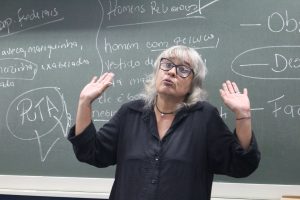 A autora do livro “Masculino, o gênero do Jornalismo: modos de produção das notícias”, Márcia Veiga, ministrou a oficina “Calçando o sapato do outro”, que teve início com apresentações entre as participantes e um debate sobre gênero. A pesquisadora refletiu sobre como tudo é generificado em nossa sociedade, apontando que, mesmo de forma indireta, estamos constantemente falando sobre gênero. “Tudo que tem mais valor é convencionado como masculino. A força, coragem e resiliência são vistos como atributos masculinos, enquanto a sensibilidade é considerada uma característica feminina”, observou a professora. Ela ainda destacou que, na hierarquia masculinista das universidades, a docência é o “feminino”, enquanto a pesquisa é o “masculino”, sendo muito mais prestigiada.