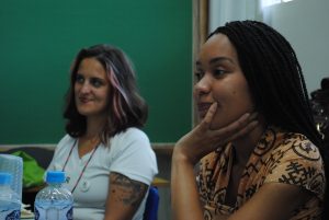 Após o debate, as participantes foram divididas em grupos de três e receberam uma folha com “papéis” que deveriam interpretar, como deputados federais, madames e homens religiosos. Em seguida, foi exibida no telão a imagem de uma drag queen negra e os grupos foram solicitados a descrever a pessoa da foto de acordo com o pensamento dos papéis que estavam interpretando. As descrições foram em sua maioria adjetivos pejorativos, pois a ideia era entender como cada grupo identifica os indivíduos e grupos sociais. Márcia Veiga explicou que a intenção da atividade era levar as participantes a refletir sobre como frequentemente julgamos e estereotipamos as pessoas. A proposta era descrever e não julgar ou usar adjetivos, destacando que, ao “calçar o sapato do outro”, tendemos a reforçar estereótipos.