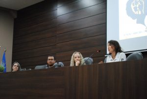 Mesa de violência contra a mulher com integrantes Dra Marcela Godoy, Dr Antonio Bispo, Dra Ana Paula e Delegada Cláudia Kruger respectivamente. Foto por Milena Leal