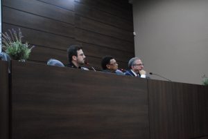 Mesa de Racismo Religioso  com os integrantes Dra Patrícia Giardini, Dr Ali Mustapha e Rafael Miranda da esquerda para a direita respectivamente. Foto por Milena Leal