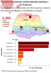 Dados divulgados via e-mail pelo Centro de Análise, Planejamento e Estatísticas da Secretaria de Estado da Segurança Pública do Paraná (Sesp-PR) mostram que, em 2022, o número de ocorrências envolvendo homofobia e transfobia caiu no estado. Em 2021, foram registradas 1.560 ocorrências no total. No período de janeiro a novembro de 2022, o número decresceu para 1.382. Entretanto os números podem não corresponder com a realidade da violência LGBTI+ na cidade como destaca Thaís Boamorte, “A violência deve ser maior do que mostram os números. Dependemos dos critérios da Sesp para registar esses boletins, dessa forma, existe uma alta subnotificação mesmo que a LGBTfobia seja equiparada ao crime de racismo”.