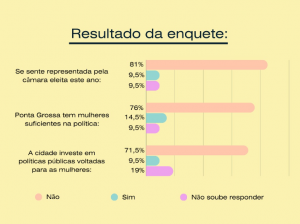 As estudantes de jornalismo, Ester Roloff e Juliana Goltz, realizaram uma enquete anônima sobre a participação feminina na política na segunda-feira (28), após o segundo turno das eleições em Ponta Grossa para sondar como as eleitoras percebem a participação das mulheres na política local e a proposição de políticas públicas para mulheres. A enquete foi realizada em dois pontos na região central da cidade com grande circulação de pessoas, no calçadão e no terminal de ônibus, durante o período da tarde, e foram obtidas 31 respostas. A maioria das mulheres abordadas preferiu não participar da enquete.