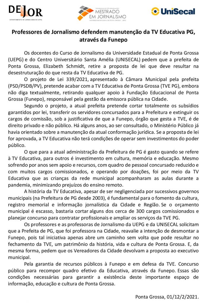 Professores de Jornalismo defendem manutenção da TV Educativa PG, através da Funepo