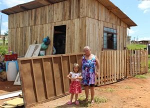 Dona Terezinha, 65, com uma de suas netas em frente a residência recém construída na ocupação Ericson John Duarte.