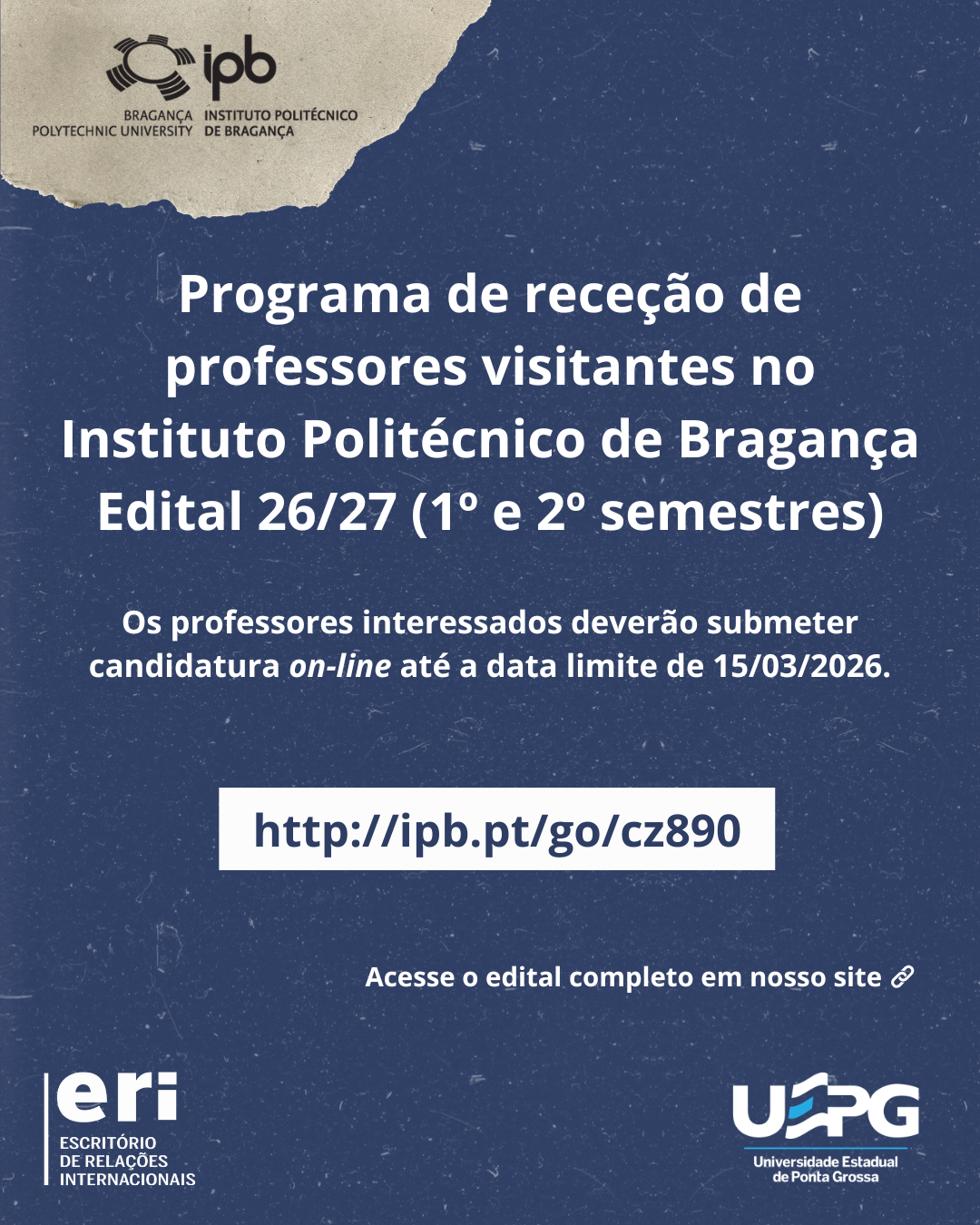 Estão abertas as inscrições para o Programa de receção de professores visitantes no Instituto Politécnico de Bragança – Edital 26/27 (1º e 2º semestres). A seleção é voltada para professores doutorados com currículo científico de impacto internacional. Os contemplados irão lecionar disciplinas de um ciclo de estudos (4h/semana). O professor visitante deverá permanecer no IPB …