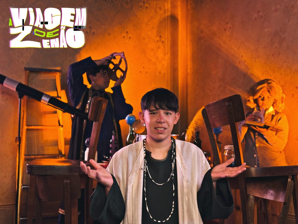 Sinopse: A Viagem de Zenão conta a história de um noviço meio atrapalhado que, por causa de um feitiço malfeito de um monge alquimista, acaba vivendo uma aventura inesperada. A ideia era trazer o maior sábio do futuro para zoar o famoso Galileu Galilei… mas o feitiço dá errado e quem aparece é um garotinho nada comum. Daí em diante, a peça vira uma viagem no tempo divertida e curiosa, para mostrar que ciência, imaginação e amizade podem andar de mãos dadas.