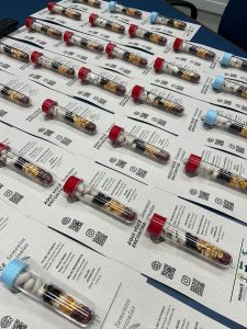 Tubetes com sementes crioulas de milho (roxo e resistência) e de feijão (vermelho e de porco).