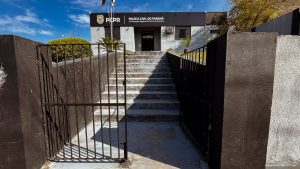 O portão da delegacia se tornou uma barreira simbólica entre a justiça e a impunidade de um crime. Foto: Amanda Stafin