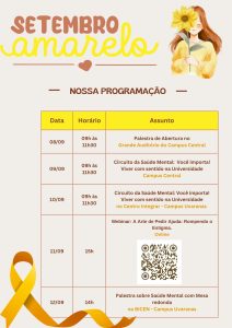 A semana de eventos do Setembro Amarelo está a todo vapor! Gostaríamos de reforçar o convite para que vocês aproveitem a oportunidade de participar da nossa programação. A sua presença e o seu engajamento são essenciais para fortalecermos a nossa comunidade.