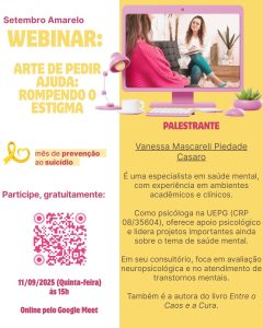 E nesta quinta-feira, dia 11 de setembro, às 15h, teremos um evento especial e muito acessível: o webinar “Arte de Pedir Ajuda: Rompendo o Estigma” com a psicóloga Vanessa Casaro. A grande vantagem é que o evento será online, pelo Google Meet, o que significa que você pode participar sem precisar sair do seu setor.