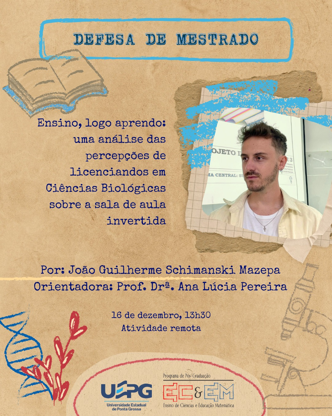 O Programa de Pós-Graduação em Ensino de Ciências e Educação Matemática (PPGECEM) anuncia a defesa de Mestrado do João Guilherme Schimanski Mazepa, que apresentará seu estudo intitulado “Ensino, Logo Aprendo: Uma Análise das Percepções de Licenciandos em Ciências Biológicas sobre a Sala de Aula Invertida”. A sessão será realizada no dia 16 de dezembro, às …