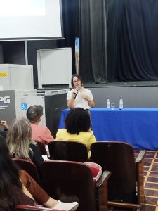 Durante a exposição, a pesquisadora destacou como os estudos linguísticos — especialmente nas áreas de fonética, fonologia e aquisição da linguagem — podem contribuir de forma significativa para práticas pedagógicas inclusivas. A trajetória acadêmica da professora Marian reforça esse compromisso com a inclusão. Com atuação consolidada no campo da Linguística, sua pesquisa envolve, entre outros temas, o desenvolvimento da linguagem e da leitura em sujeitos com Síndrome de Down, bem como aspectos prosódicos e cognitivos relacionados ao processamento linguístico.