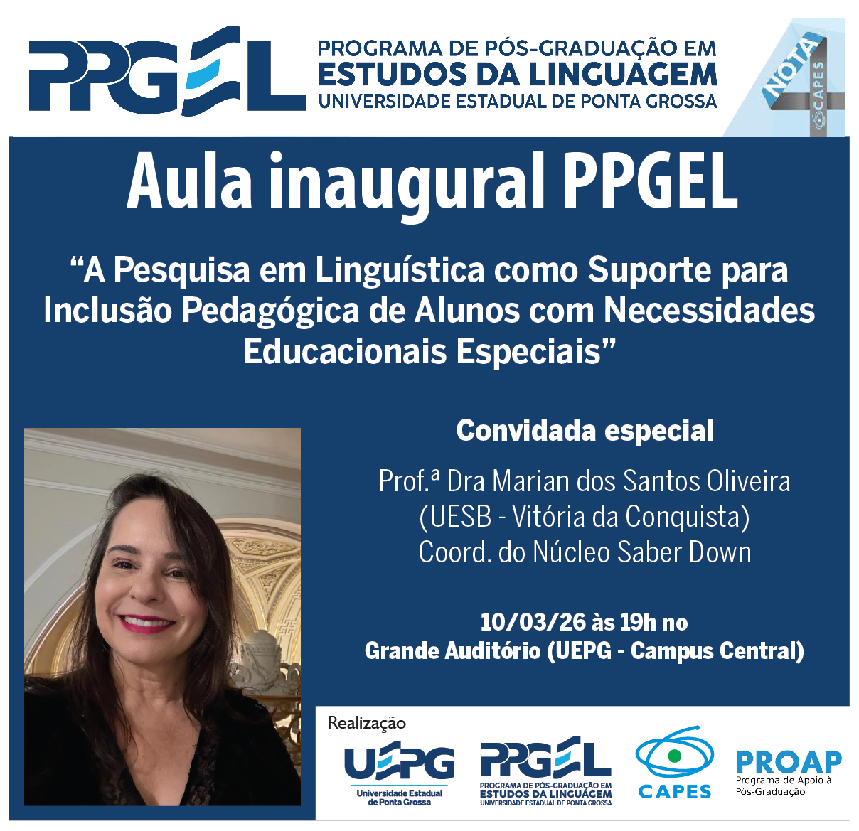O Programa de Pós-Graduação em Estudos da Linguagem (PPGEL) dará início às atividades acadêmicas de 2026 com a realização de sua Aula Inaugural com a convidada Profª Dra. Marian dos Santos Oliveira, docente da Universidade Estadual do Sudoeste da Bahia (UESB), campus de Vitória da Conquista, pesquisadora reconhecida na área de estudos da linguagem. A …
