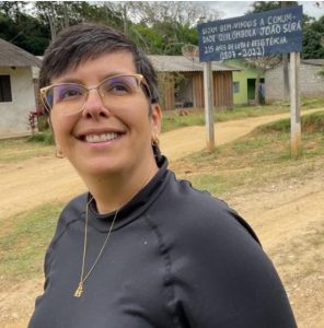 Descrição da imagem: Na foto aparece uma mulher branca, de cabelos pretos e curtos. Ela usa óculos com aros retangulares e transparentes e está sorrindo. Veste blusa preta lisa e usa uma corrente dourada. Ao fundo, se vê uma paisagem com casas de alvenaria e uma placa indicando o local onde a foto foi feita.