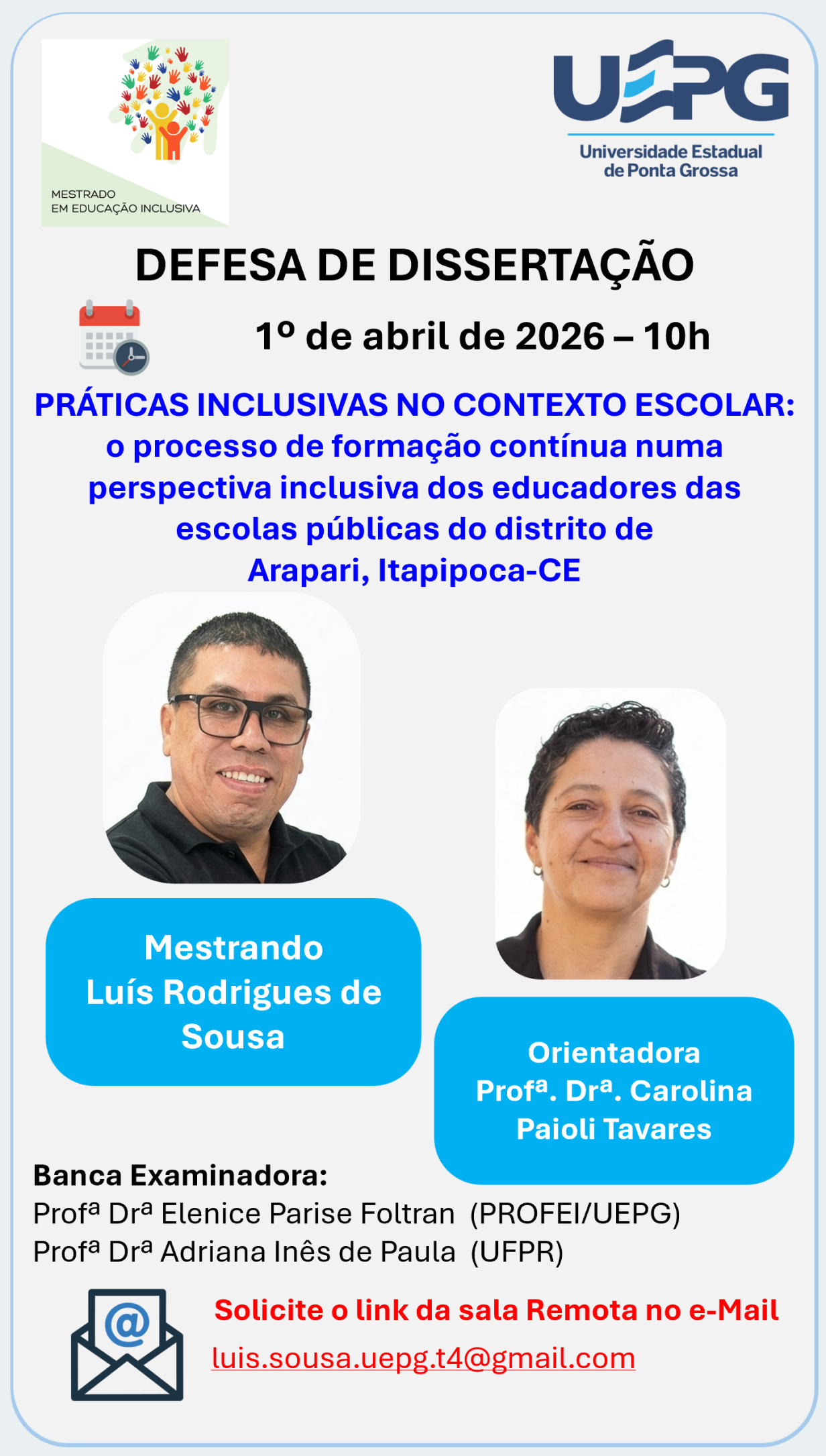 Defesa de Dissertação 1º abril 2026 às 10h Luís Rodrigues de Sousa O Programa de Pós-Graduação em Educação Inclusiva (PROFEI/UEPG) convida a comunidade acadêmica e demais interessados para a defesa de dissertação do mestrando Luís Rodrigues de Sousa, do Mestrado Profissional em Educação Inclusiva. Título da dissertação: PRÁTICAS INCLUSIVAS NO CONTEXTO ESCOLAR: o processo de …