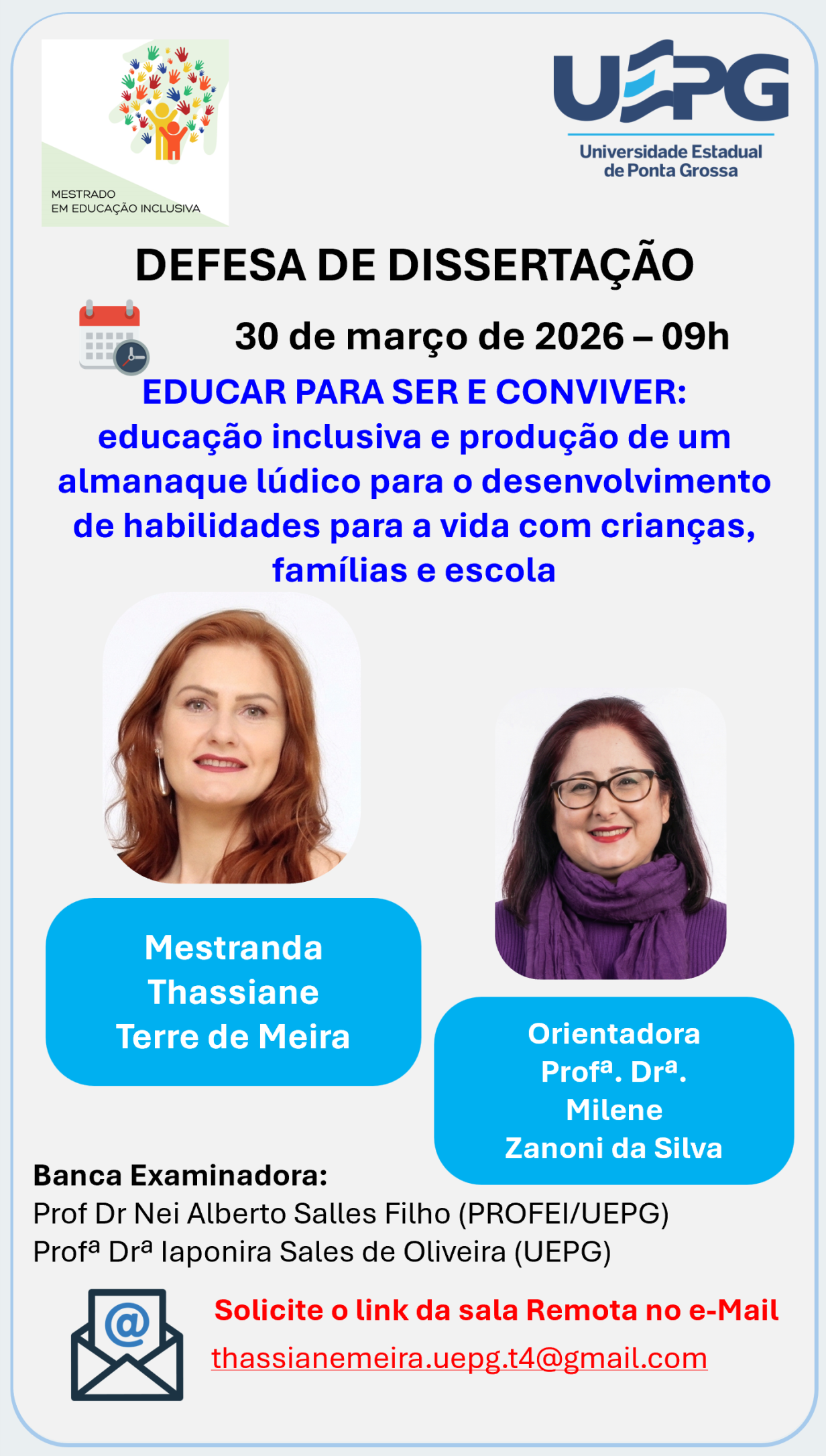 Defesa de Dissertação 25 mar. 2026 às 19h Joelma Aparecida Krepel O Programa de Pós-Graduação em Educação Inclusiva (PROFEI/UEPG) convida a comunidade acadêmica e demais interessados para a defesa de dissertação da mestranda Joelma Aparecida Krepel, do Mestrado Profissional em Educação Inclusiva. Título da dissertação: A INTERFACE ENTRE A EDUCAÇÃO ESPECIAL NA PERSPECTIVA INCLUSIVA E …