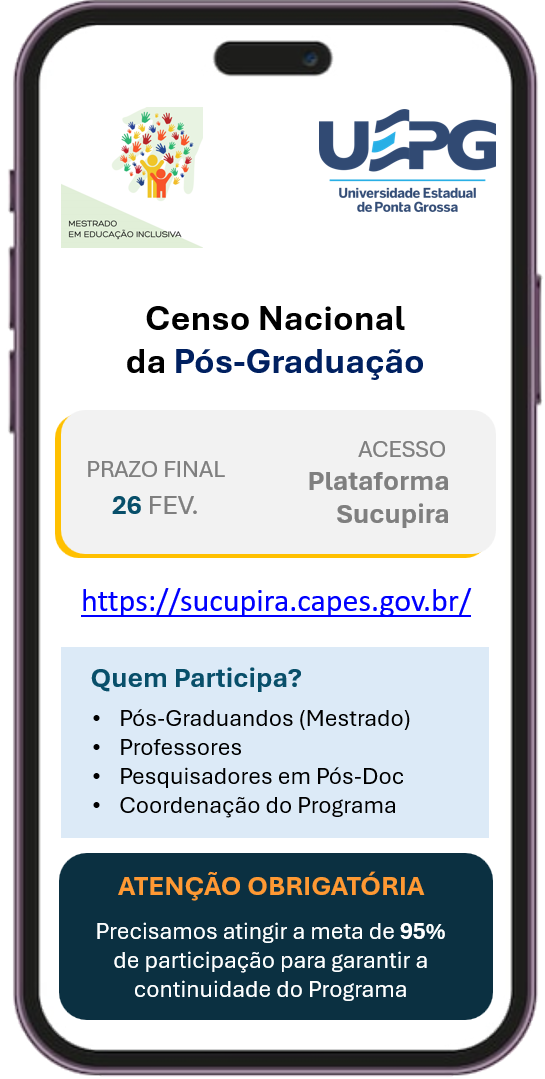 O Programa de Pós-Graduação Mestrado Profissional em Educação Inclusiva (PROFEI/UEPG) informa que a CAPES instituiu, a partir deste ano, o Censo da Pós-Graduação Stricto Sensu. Trata-se de um questionário eletrônico que leva pouco mais de 2 minutos para ser respondido.