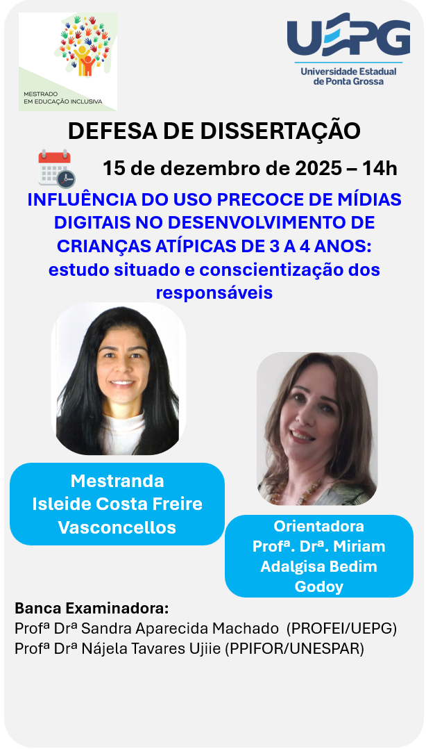 O Programa de Pós-Graduação em Educação Inclusiva (PROFEI/UEPG) convida a comunidade acadêmica e demais interessados para a defesa de dissertação da mestranda Isleide Costa Freire Vasconcellos, do curso de Mestrado Profissional em Educação Inclusiva.