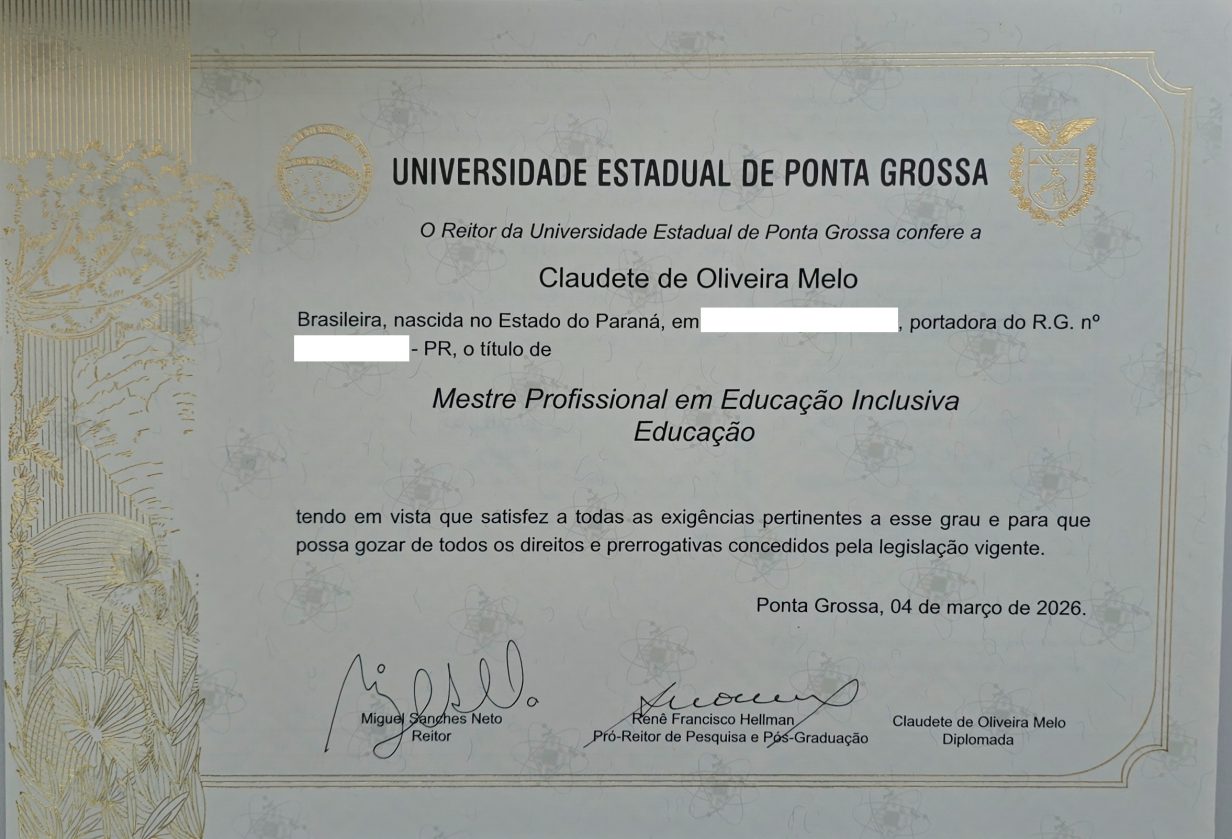 Defesa de Dissertação 1º abril 2026 às 08h Mailson da Silveira Porto O Programa de Pós-Graduação em Educação Inclusiva (PROFEI/UEPG) convida a comunidade acadêmica e demais interessados para a defesa de dissertação do mestrando Mailson da Silveira Porto, do Mestrado Profissional em Educação Inclusiva. Título da dissertação: PROCESSO INCLUSIVO NA REDE MUNICIPAL DE ENSINO DE …