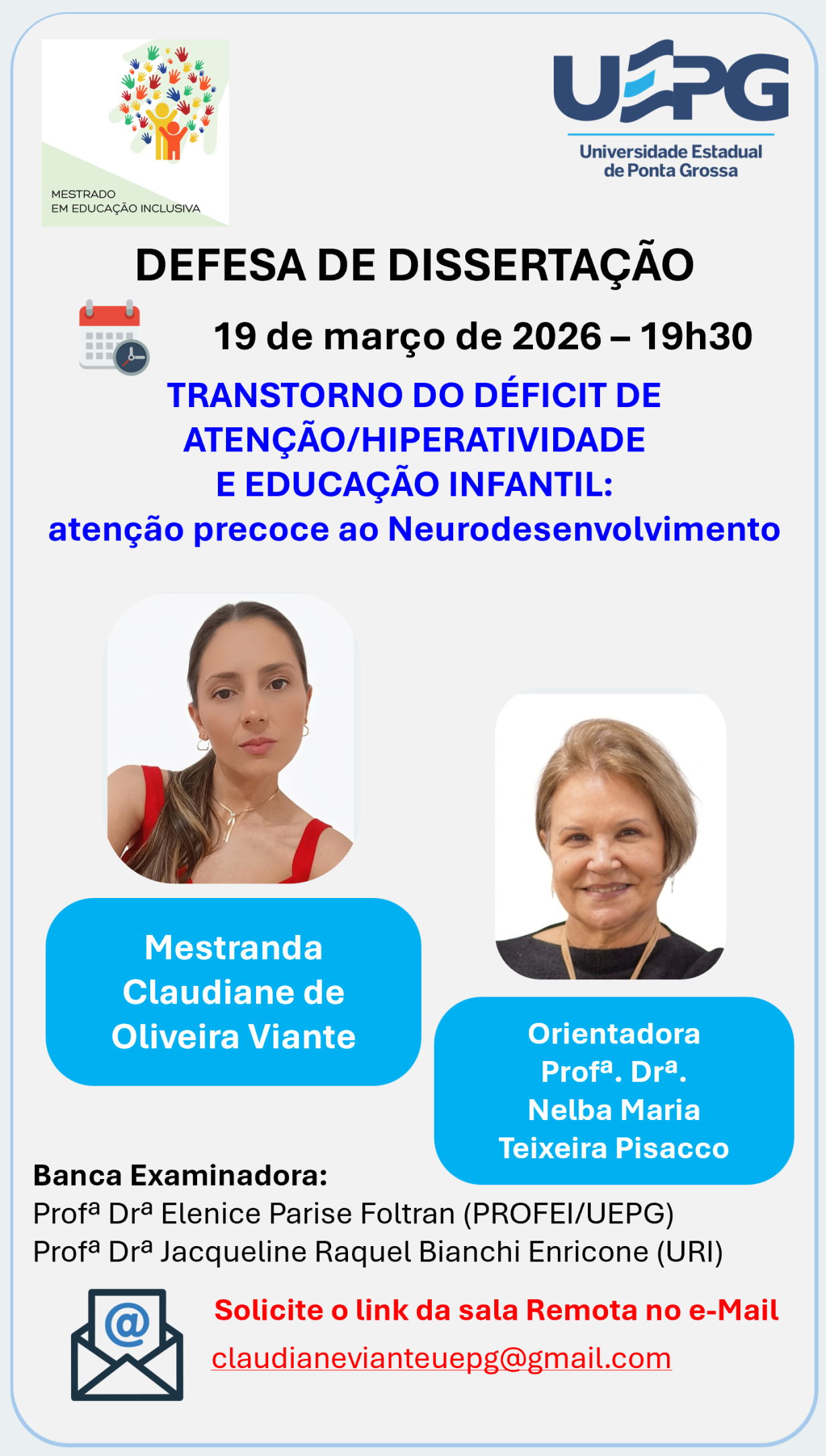 Defesa de Dissertação – PROFEI/UEPG O Programa de Pós-Graduação em Educação Inclusiva (PROFEI/UEPG) convida a comunidade acadêmica e demais interessados para a defesa de dissertação da mestranda Claudiane de Oliveira Viante, do Mestrado Profissional em Educação Inclusiva. Título da dissertação: TRANSTORNO DO DÉFICIT DE ATENÇÃO/HIPERATIVIDADE E EDUCAÇÃO INFANTIL: atenção precoce ao Neurodesenvolvimento Data e horário: …