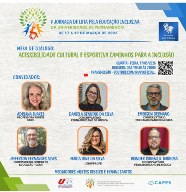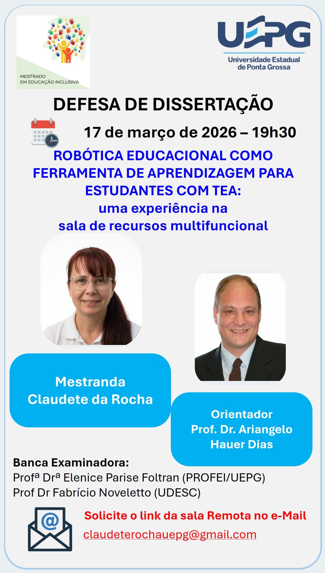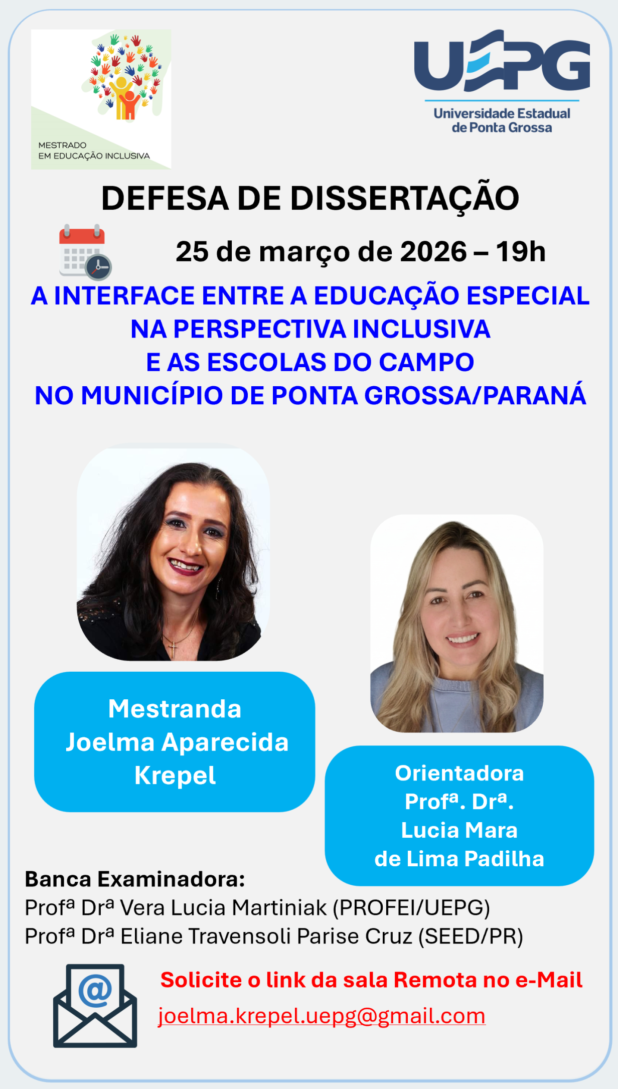 Defesa de Dissertação 25 mar. 2026 às 19h Joelma Aparecida Krepel O Programa de Pós-Graduação em Educação Inclusiva (PROFEI/UEPG) convida a comunidade acadêmica e demais interessados para a defesa de dissertação da mestranda Joelma Aparecida Krepel, do Mestrado Profissional em Educação Inclusiva. Título da dissertação: A INTERFACE ENTRE A EDUCAÇÃO ESPECIAL NA PERSPECTIVA INCLUSIVA E …
