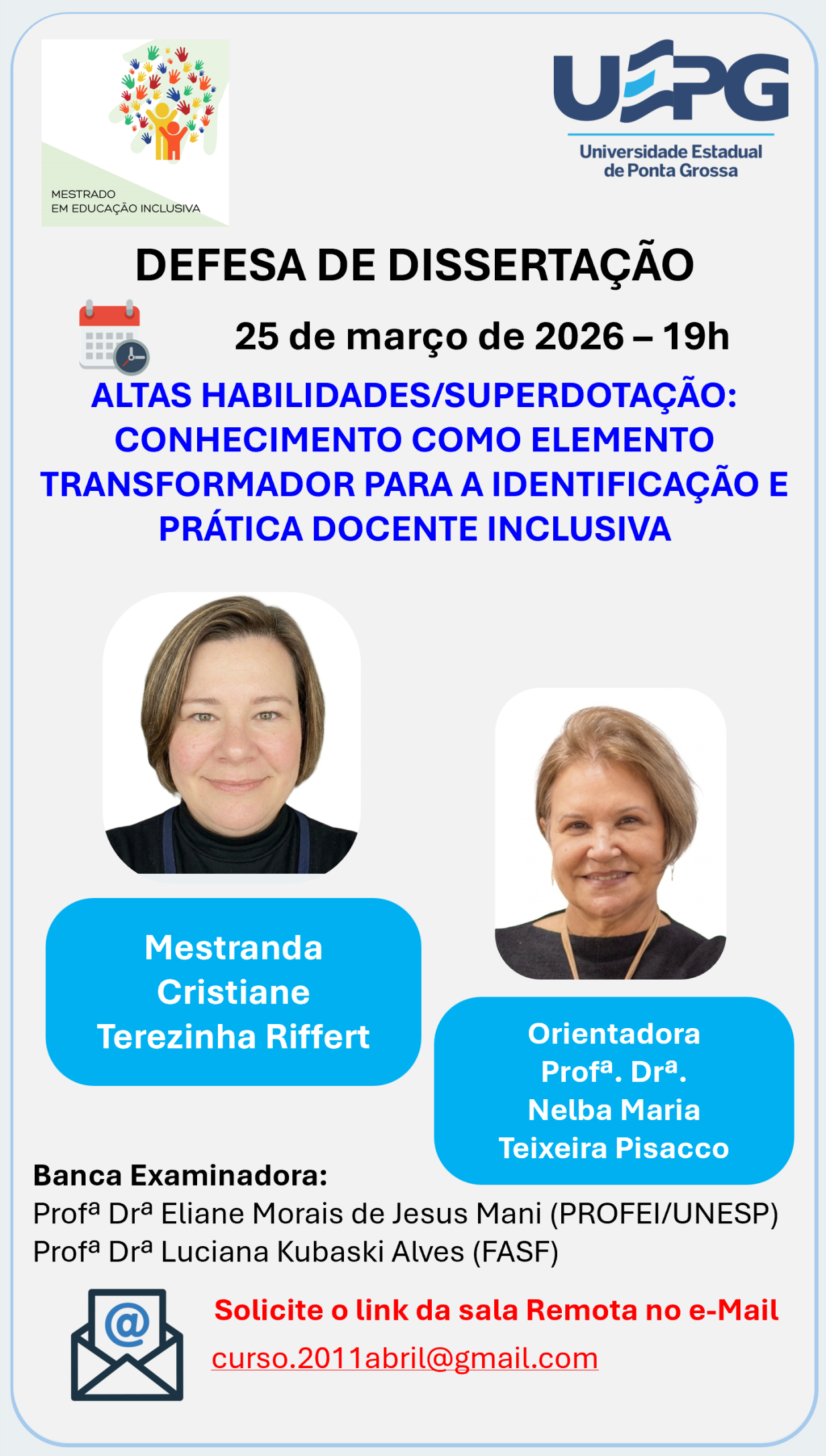 Defesa de Dissertação 25 mar. 2026 às 19h Cristiane Terezinha Riffert O Programa de Pós-Graduação em Educação Inclusiva (PROFEI/UEPG) convida a comunidade acadêmica e demais interessados para a defesa de dissertação da mestranda Cristiane Terezinha Riffert, do Mestrado Profissional em Educação Inclusiva. Título da dissertação: ALTAS HABILIDADES/SUPERDOTAÇÃO: CONHECIMENTO COMO ELEMENTO TRANSFORMADOR PARA A IDENTIFICAÇÃO E …