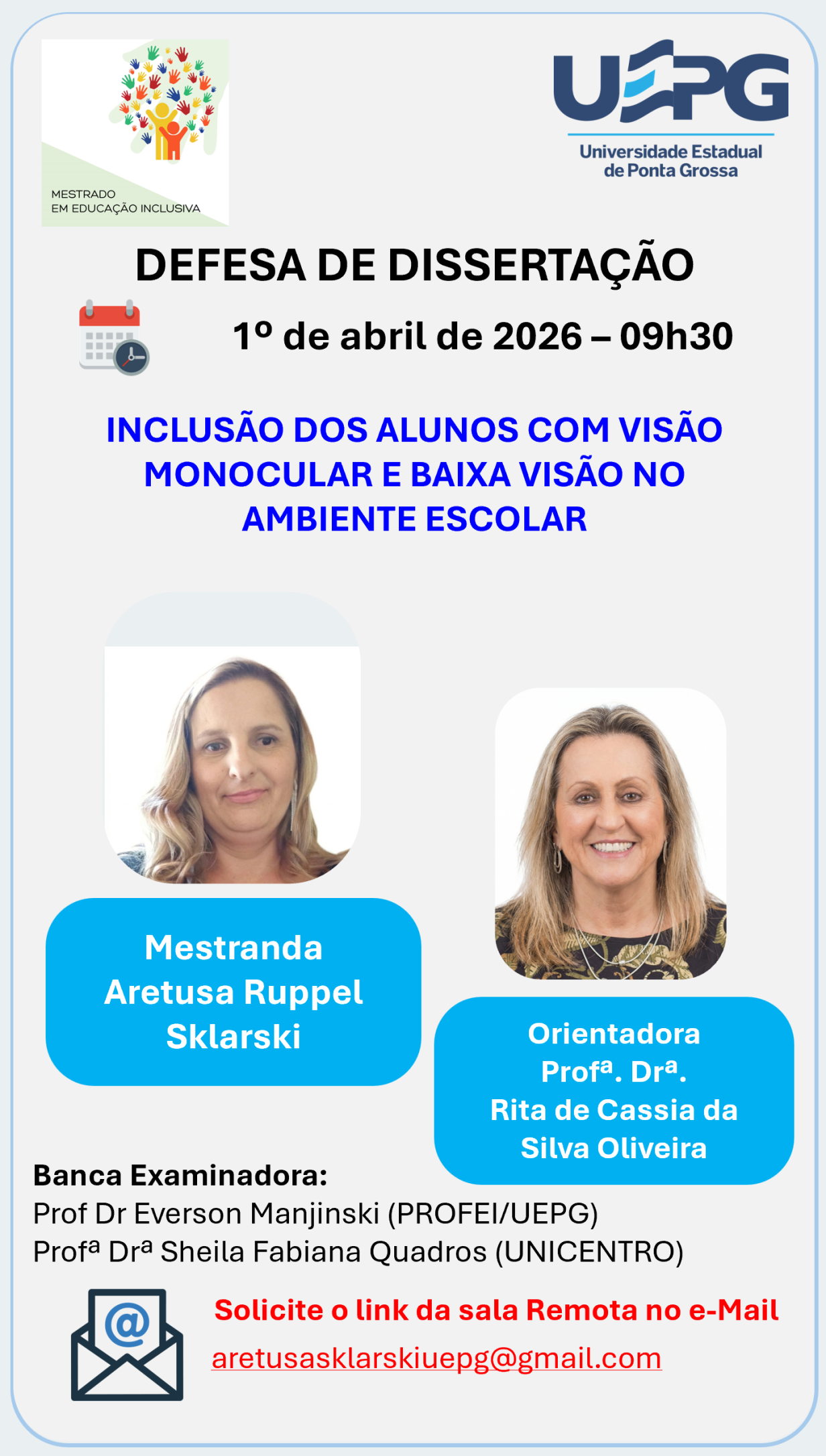 Defesa de Dissertação 1º abril 2026 às 09h30 Aretusa Ruppel Sklarski O Programa de Pós-Graduação em Educação Inclusiva (PROFEI/UEPG) convida a comunidade acadêmica e demais interessados para a defesa de dissertação da mestranda Aretusa Ruppel Sklarski, do Mestrado Profissional em Educação Inclusiva. Título da dissertação: INCLUSÃO DOS ALUNOS COM VISÃO MONOCULAR E BAIXA VISÃO NO …