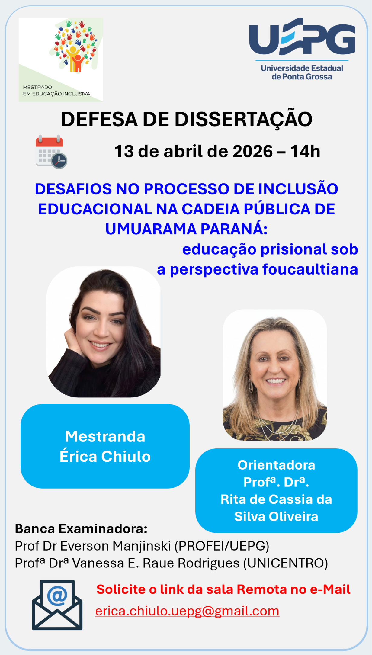 Defesa de Dissertação 31 de março de 2026 às 14h Érica Chiulo O Programa de Pós-Graduação em Educação Inclusiva (PROFEI/UEPG) convida a comunidade acadêmica e demais interessados para a defesa de dissertação da mestranda Érica Chiulo, do Mestrado Profissional em Educação Inclusiva. Título da dissertação: DESAFIOS NO PROCESSO DE INCLUSÃO EDUCACIONAL NA CADEIA PÚBLICA DE …
