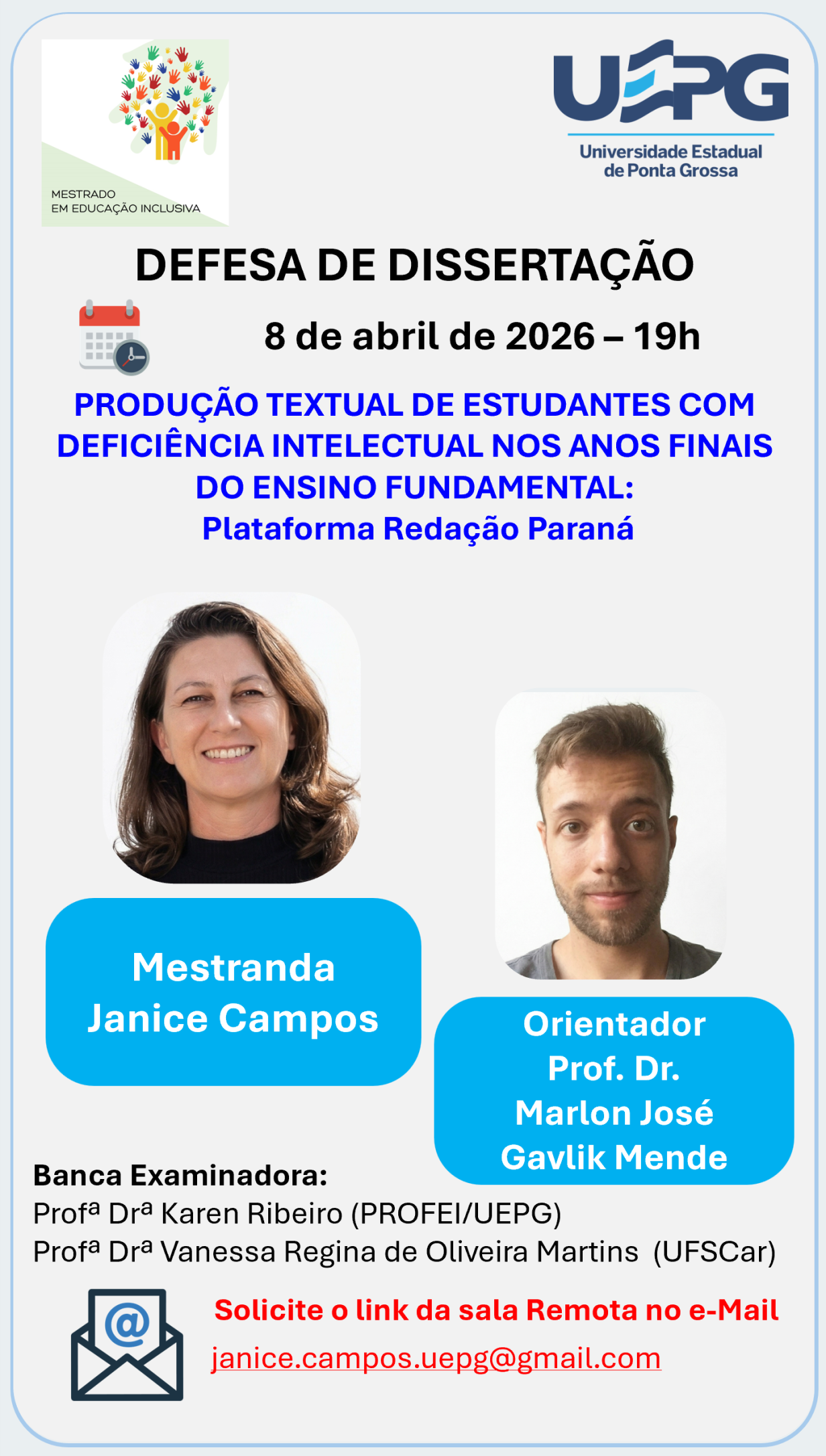 Defesa de Dissertação 8 de abril de 2026 às 19h Janice Campos O Programa de Pós-Graduação em Educação Inclusiva (PROFEI/UEPG) convida a comunidade acadêmica e demais interessados para a defesa de dissertação da mestranda Janice Campos, do Mestrado Profissional em Educação Inclusiva. Título da dissertação: PRODUÇÃO TEXTUAL DE ESTUDANTES COM DEFICIÊNCIA INTELECTUAL NOS ANOS FINAIS …