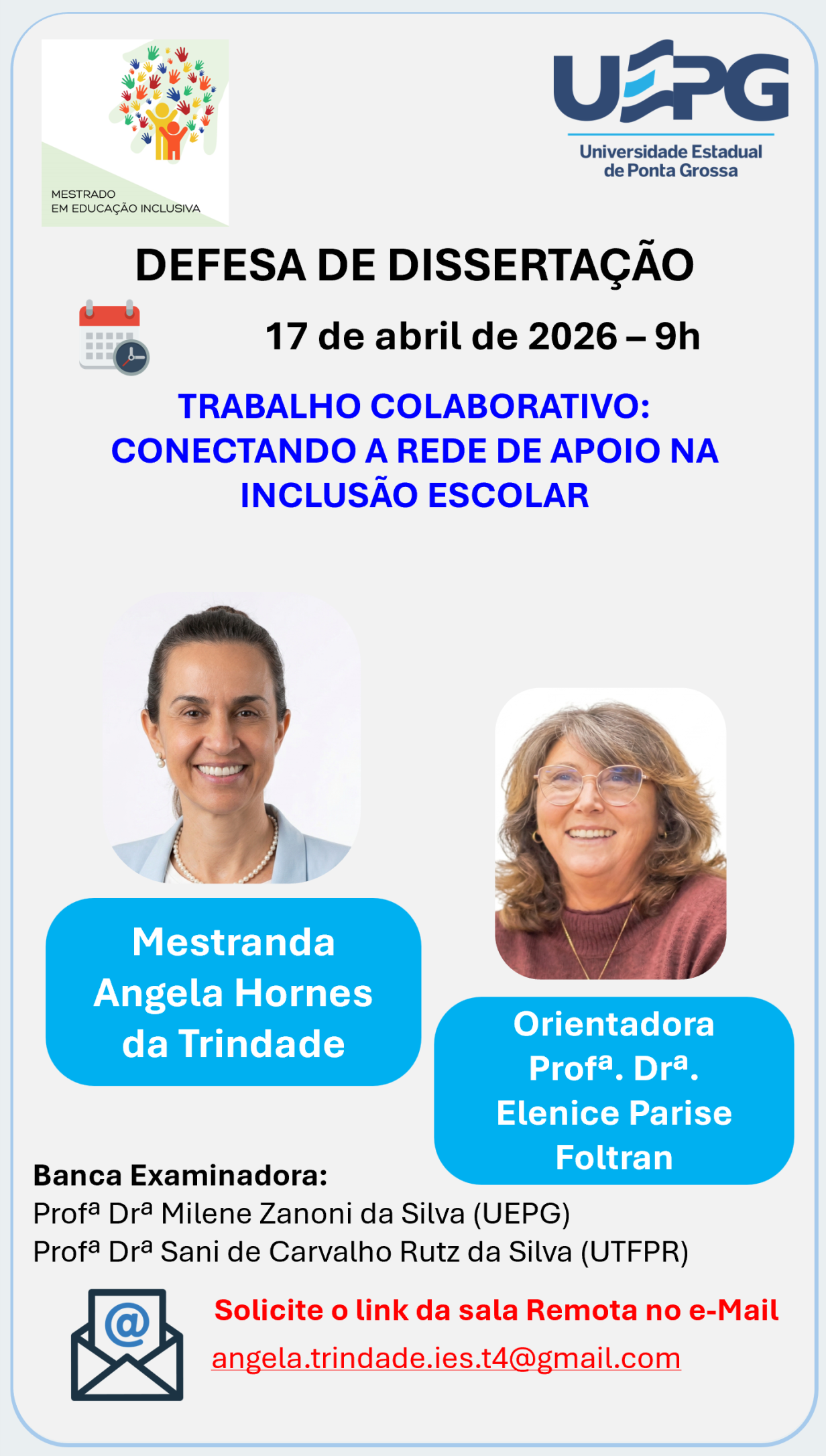 Defesa de Dissertação 17 de abril de 2026 às 9h Angela Hornes da Trindade O Programa de Pós-Graduação em Educação Inclusiva (PROFEI/UEPG) convida a comunidade acadêmica e demais interessados para a defesa de dissertação da mestranda Angela Hornes da Trindade, do Mestrado Profissional em Educação Inclusiva. Título da dissertação: TRABALHO COLABORATIVO: CONECTANDO A REDE DE …