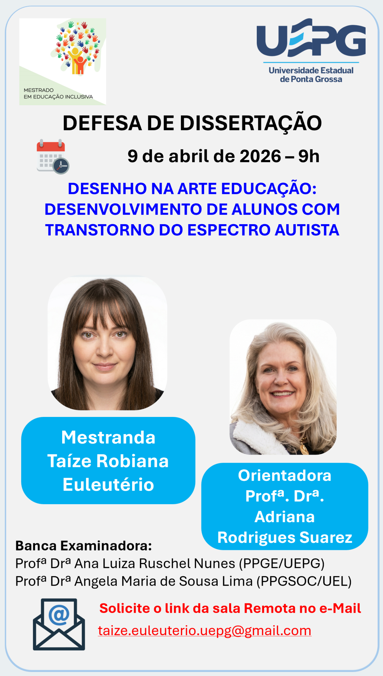 Defesa de Dissertação 9 de abril de 2026 às 9h Taíze Robiana Euleutério O Programa de Pós-Graduação em Educação Inclusiva (PROFEI/UEPG) convida a comunidade acadêmica e demais interessados para a defesa de dissertação da mestranda Taíze Robiana Euleutério, do Mestrado Profissional em Educação Inclusiva. Título da dissertação: DESENHO NA ARTE EDUCAÇÃO: DESENVOLVIMENTO DE ALUNOS COM …