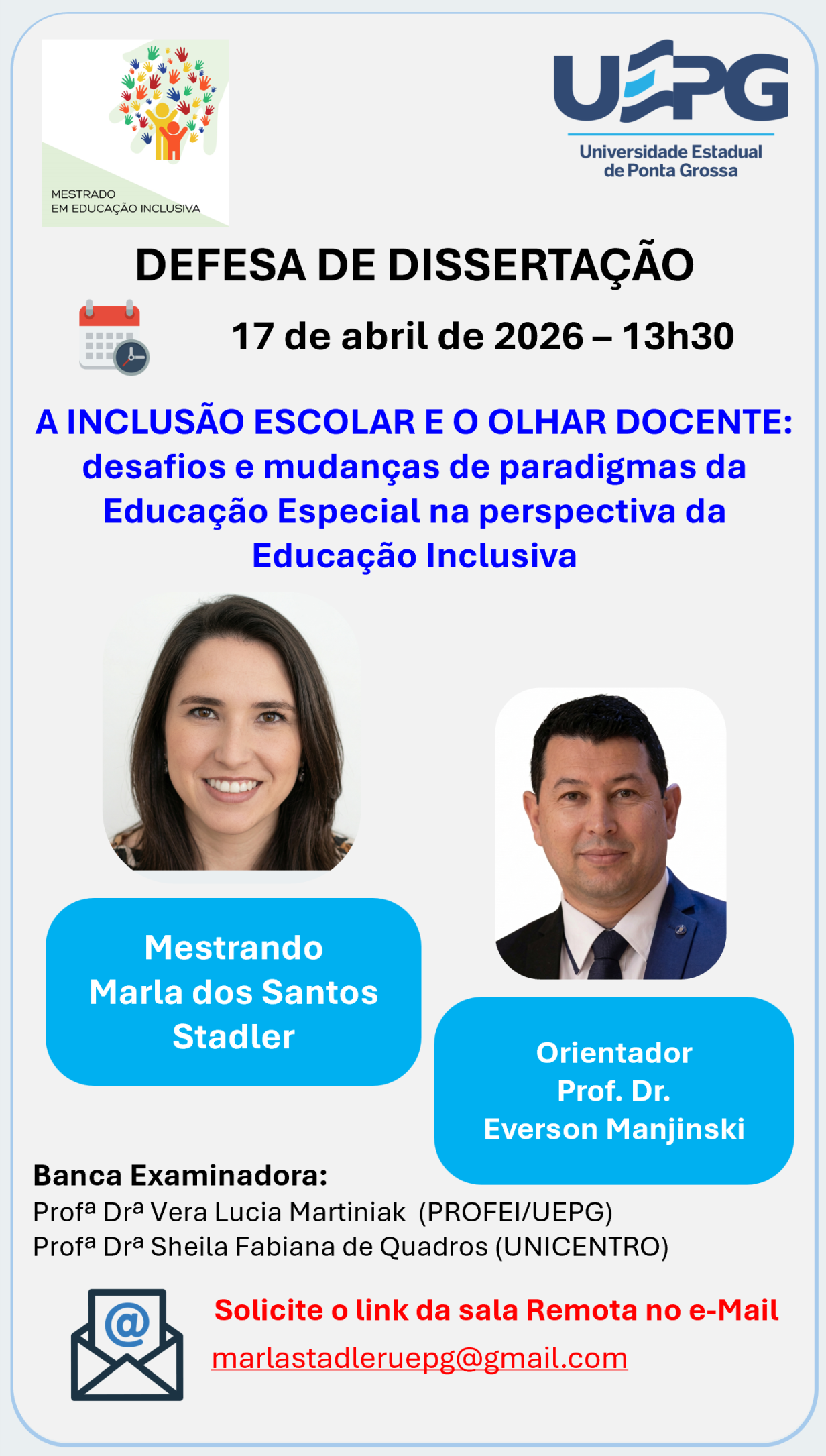 Defesa de Dissertação 17 de abril de 2026 às 13h30 Marla dos Santos Stadler O Programa de Pós-Graduação em Educação Inclusiva (PROFEI/UEPG) convida a comunidade acadêmica e demais interessados para a defesa de dissertação da mestranda Marla dos Santos Stadler, do Mestrado Profissional em Educação Inclusiva. Título da dissertação: A INCLUSÃO ESCOLAR E O OLHAR …