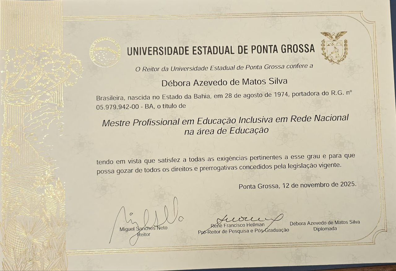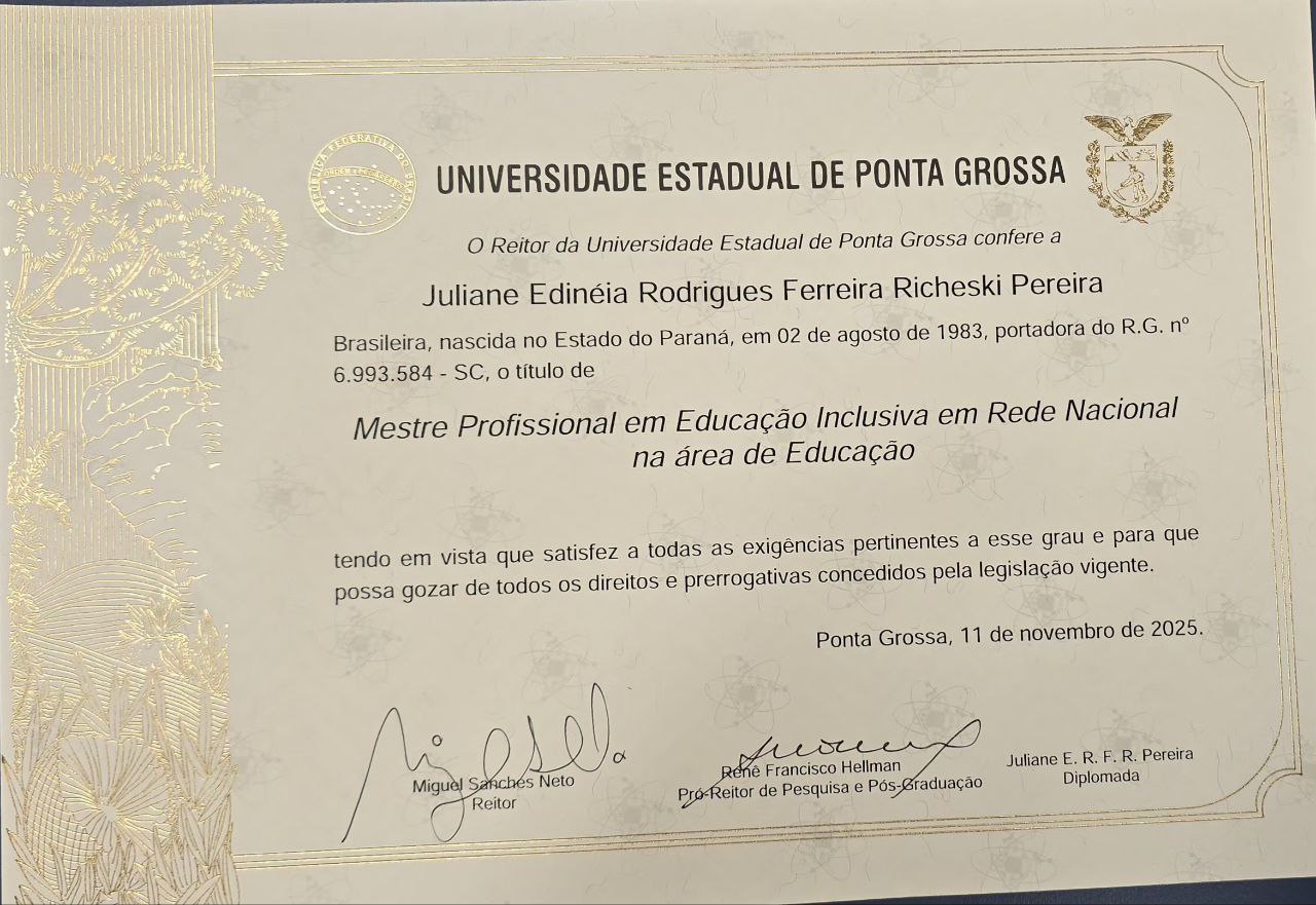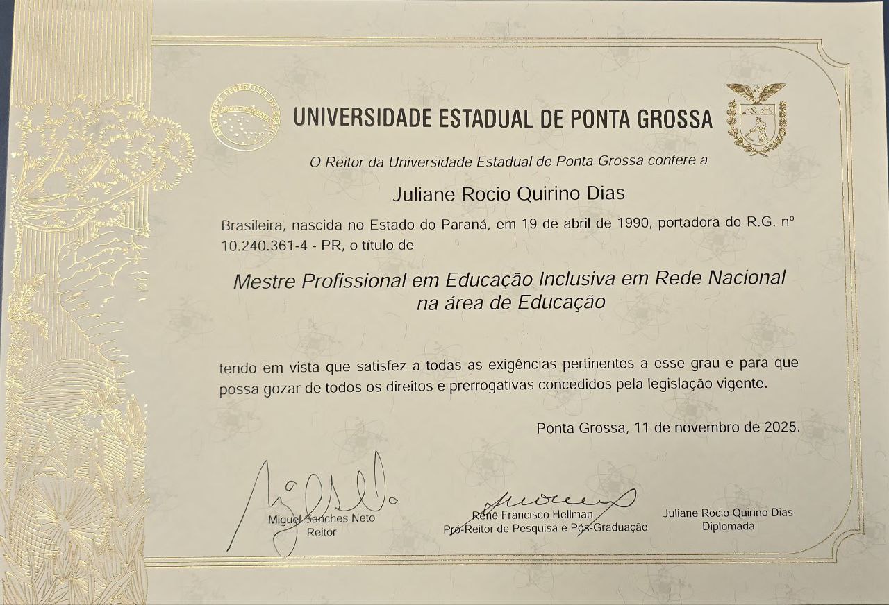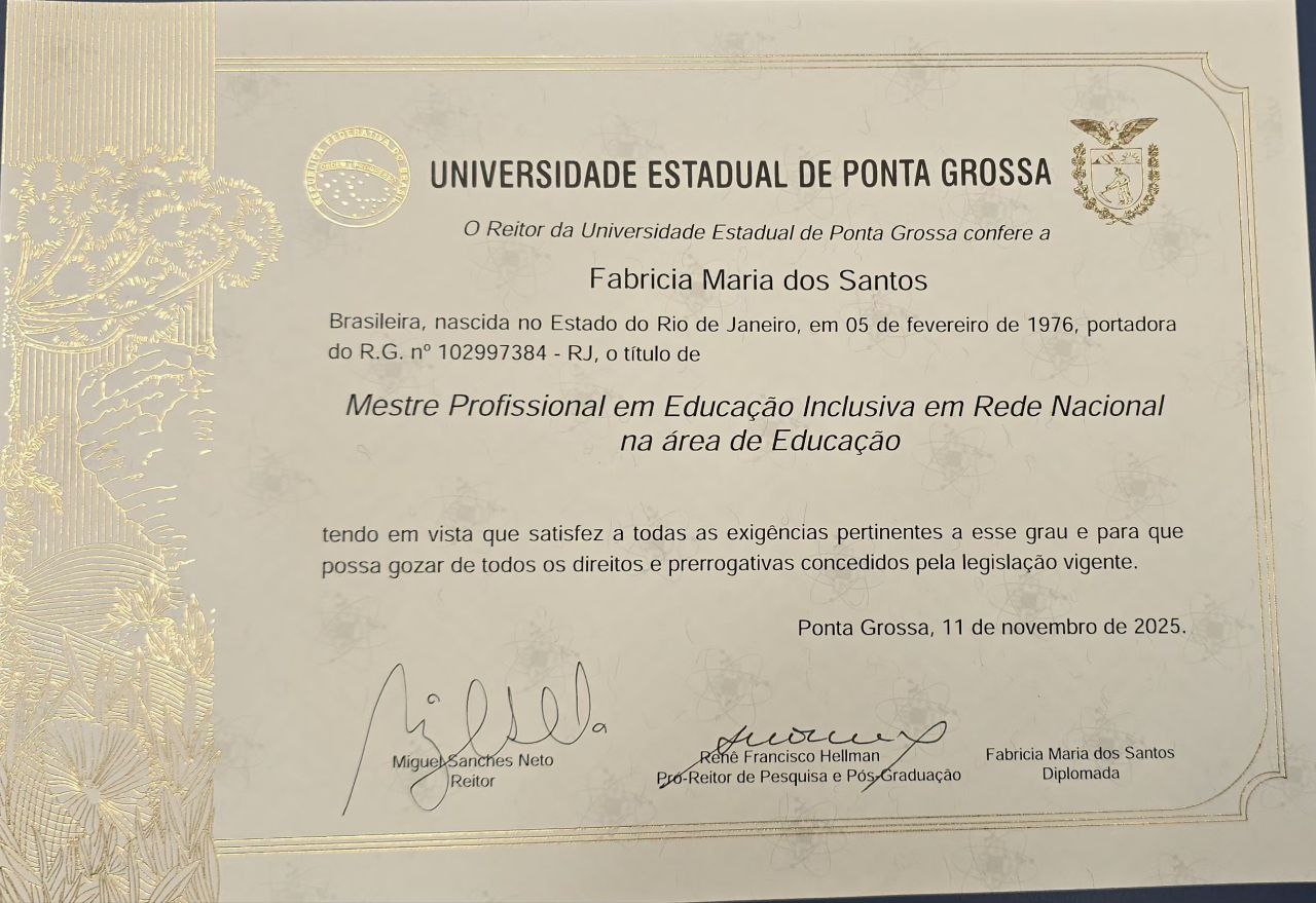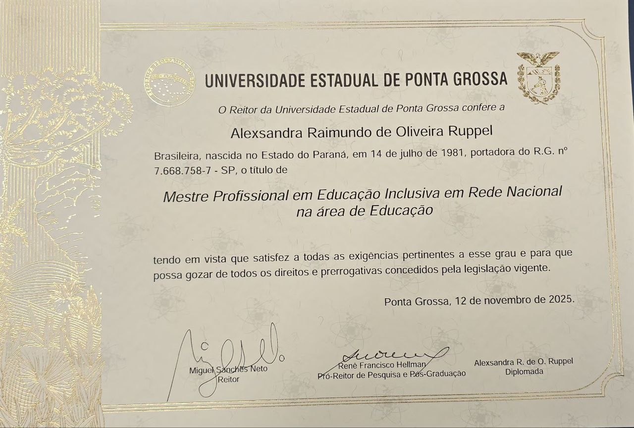 O Programa de Pós-Graduação em Educação Inclusiva (PROFEI/UEPG) tem a alegria de informar que hoje foram assinados os últimos diplomas de Mestrado Profissional em Educação Inclusiva em Rede Nacional na área de Educação deste ano de 2025.